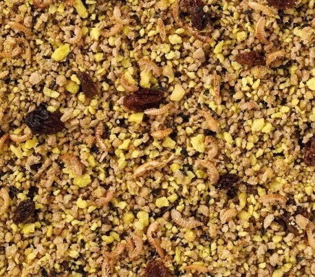 La pâtée est enrichie de crevettes et de gammares séchés, raisins, baies de sorbier et un mix de légumes.
